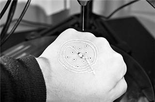 据物理学家组织网25日报道,在一项开创性的新研究中,美国研究人员使用定制的低成本3D打印机,首次在手上打印出电子产品。借助新技术,战场上的士兵能在身体上打印出临时传感器以检测化学或生物制剂,或打印太阳能电池以给电子设备充电,而且只需镊子就可将其剥离,也可用水冲洗掉。
