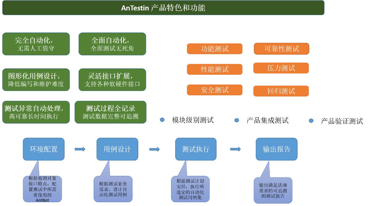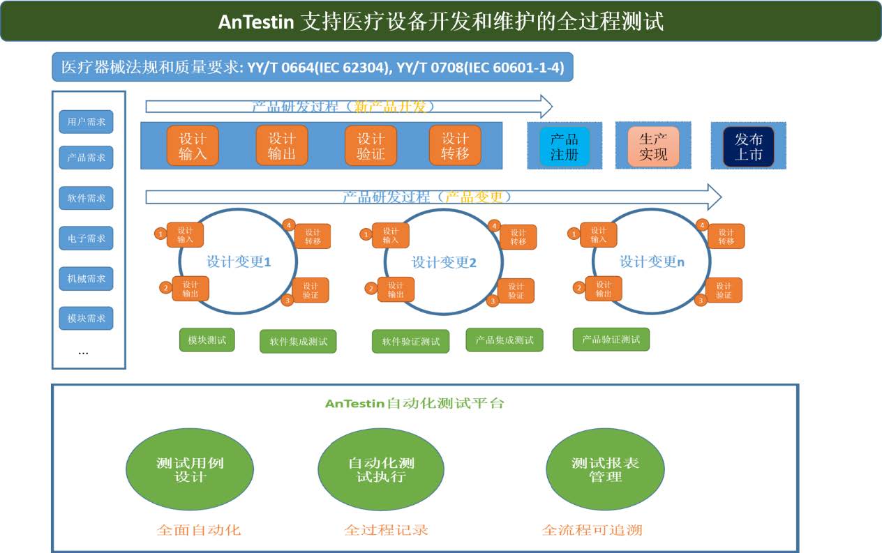 AnTestin适应于新产品研发阶段的测试和产品变更过程中的测试,全面满足 YY/T 0664 (IEC62304) 的《医疗器械软件生存周期过程》和YY/T0708 -2009 (IEC60601-1-4) 《可编程医用电气系统》的法规要求,为医疗设备和软件提供全面自动化和全面可追溯 的自动化测试服务。