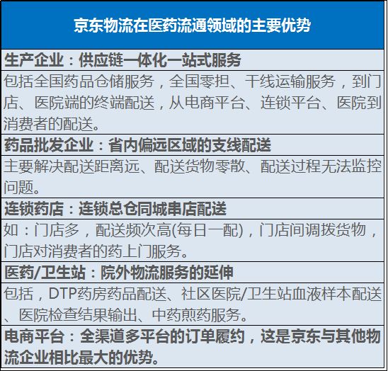 京东是继顺丰之后又一家杀入医药流通领域的第三方物流企业,京东集团副总裁、京东物流开放业务部负责人唐伟表示,京东物流在仓配一体化的供应链和基础设施领域具有先天优势。