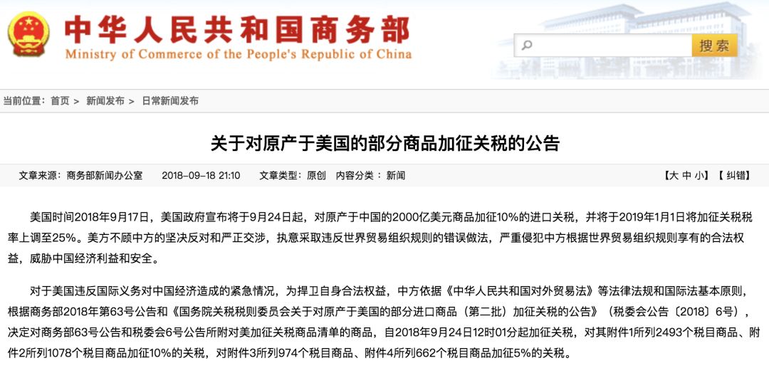 与此同时,商务部新闻发言人发表谈话表示,为了维护自身正当权益和全球自由贸易秩序,中方将不得不同步进行反制。商务部公告称,决定对商务部63号公告和税委会6号公告所附对美加征关税商品清单(中对美加征关税第二批600亿美元)的商品,自2018年9月24日12时01分起加征关税。