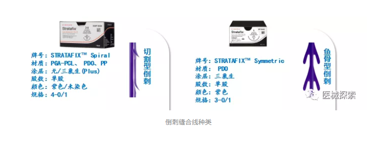 可吸收缝合线其材质分为PGLA910 聚糖乳酸910、聚卡普隆25、聚对二氧环己酮聚合物(PDO),其中倒刺缝合线为目前最先进缝合线,分为切割线倒刺缝合线和鱼骨形倒刺缝合线。在可吸收和不可吸收缝合线中,有些缝合线具有抗菌功能,运用了Plus涂层技术,采用三氯生抗菌(具体产品分析介绍见PPT/PDF缝合线全球分析研究报告)。