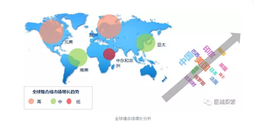 从全球来看缝合线市场在欧美增长趋势中最高,其次是南美和亚太,再次是中东和非洲。增长趋势大的主要国家也分布在欧美和亚太地区,分别有美国、中国、印度等等。全球缝合线企业众多纷纭,全球市场中美国强生爱惜康、美国美敦力柯惠和美国贝朗形成缝合线三大巨头企业,巨头之后的竞争十分激烈,知名企业有Smith&nephew、Teleflex、RESORBA等等。