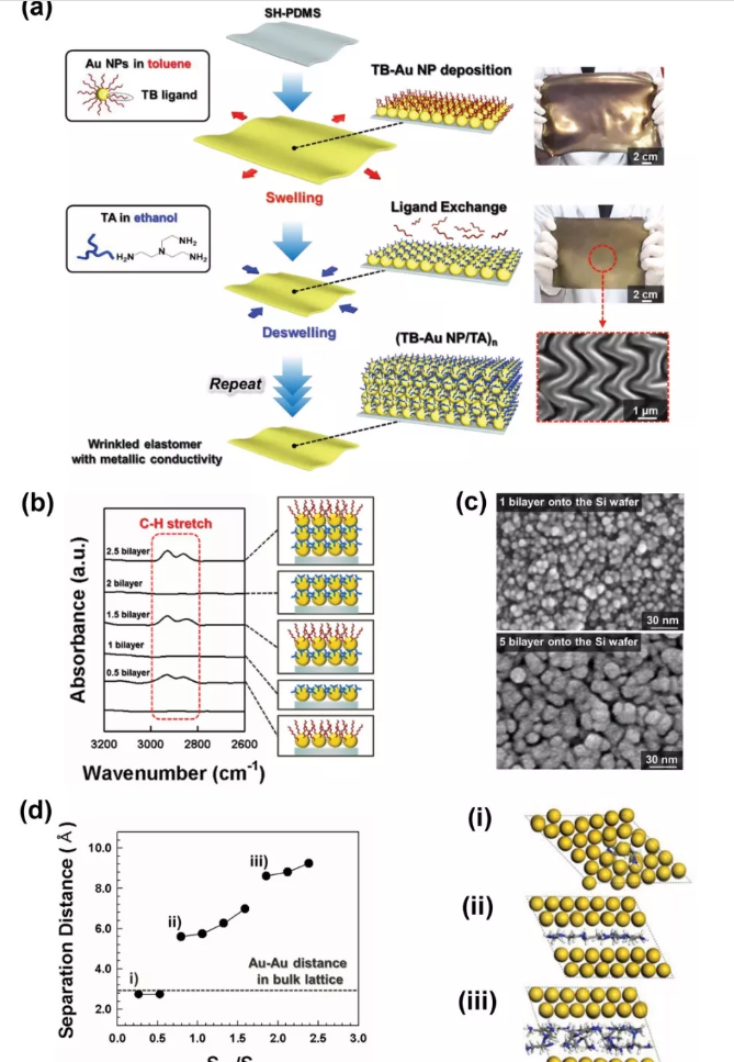 图1 a)制造褶皱弹性电极的制造过程示意图。b)(TB-Au NP / TA)n多层膜的FTIR光谱和示意图。c)(TB-Au NP / TA)n(n = 1和5)的FE-SEM图像。d)MD计算的由n个TA分子分隔的Au(100)个表面之间的最小距离与表面覆盖率的关系图。S TA/ S Au,其中S TA和S Au是n个TA分子覆盖的表面积和Au层的表面积。右侧的图像是在(i)S TA / S Au = 0.26,(ii)S TA / S Au = 0.79和(iii)S TA/ S Au = 1.85的Au原子表面之间的TA分子的MD模拟分子结构。
