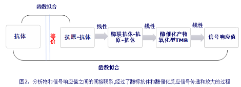 大多数生物学检测方法存在一个复杂的Test system,样品引起Test system的变化也需要在温和的条件下进行,这使得目标分子很难进行有效的分离并采用仪器分析方法进行检测,需要引入荧光标记抗体,酶标抗体,或酶催化底物等和目标分子进行反应转换成信号值,建立信号值和目标分子的间接联系,这是检测信号传递的间接性。如下图所示,在一个ELISA直接法的实验中,样品是抗体,检测体系是抗原,引起的变化目标分子抗体-抗原偶联物,而信号值代表的是TMB催化产物,TMB催化产物经过酶标抗体和目标分子抗体-抗原偶联物发生间接联系,一个ELISA方法的质量是由信号在间接的传递过程中是否和目标分子抗体-抗原偶联物线性相关决定的。相关研究请参阅小编之前的文章ELISA技术应用概览和方法学开发初析。