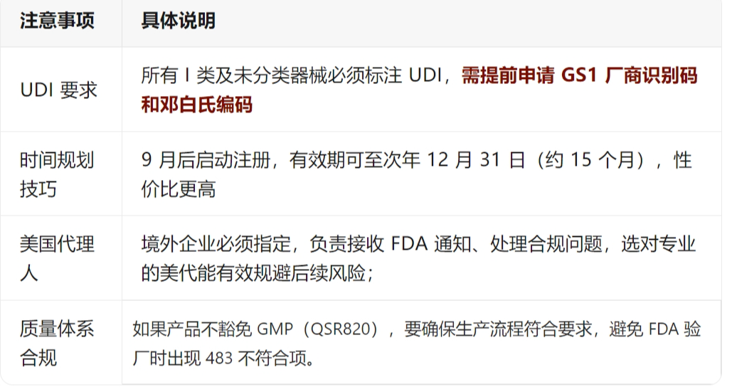 • 若 “510K 豁免但 GMP 不豁免”:需额外满足 QSR820 质量体系要求(注意:2025 年 5 月起 FDA 验厂取消提前通知,建议提前建立体系)。