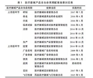 我国医疗器械法规体系的构建始于2000年《条例》的实施,经过2014年、2017年的2次修订后,法规体系的框架已经基本确立。根据产品全生命周期管理的需要,管理部门对相关配套规章做了较大的修改,基本上把原有医疗器械法规体系的内容回炉重造了一遍(医疗器械全生命周期配套规章见表1)。同时,还发布了《创新医疗器械特别审批程序》《医疗器械优先审批程序》《医疗器械生产质量管理规范》《医疗器械经营质量管理规范》等多部规范性文件。另外,为了推动这些管理规范的实施,CFDA以各种通知、公告、通告等形式发布的规范性文件就近百项。这些立法工作构建了行政法规、部门规章、规范性文件为主体框架的三级监管体系。这一切都在说明医疗器械政策法规正在经历着一场巨变。