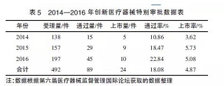 从表5可以看出,实施创新医疗器械特别审批程序后,创新医疗器械的通过量和上市量在2014-2016年均稳步增长,但由于申报量越来越大,上市率稍有起伏。2015年,CFDA批准注册脱细胞角膜基质等9个产品上市(其中有源医疗器械5项,体外诊断试剂3项,无源医疗器械1 项)。2016年,批准注册三维心脏电生理标测系统等10个产品上市(其中有源医疗器械6项,无源医疗器械3项,体外诊断试剂1项)。2016年,不管是创新医疗器械的注册申请量,还是经过审评后的通过量以及最终获批的上市量都有所上升,说明创新医疗器械特别审批这一新政继续推动着产业技术和产品的更新。