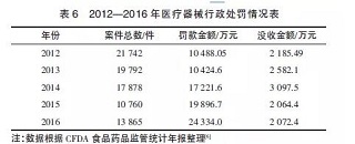 从表6可知,2012-2016年,行政处罚案件总数起伏不定。2015年查处的案件总数发生剧降,2016年有所回升。这表明《条例》修订后,由于不熟悉新的罚则,管理部门查处违法行为的行动力有所减弱,但后期增强了。从2013年起,罚款金额作为一个主要的处罚指标一直稳步上升,表明对医疗器械的监管力度和处罚力度仍在持续加强。由于法规加大了处罚力度,因企业生产经营方面的合规问题被罚高达近千万元的案例并不罕见。这是广大医疗器械生产企业所不能懈怠的。