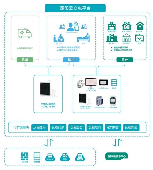 为此,蓬阳医疗基于“智能化监测设备+智能化平台系统+远程判读服务”的模式,提出了区域18导联动/静态心电医联体项目,建设以区/县级医院为中心构建与辖区内的乡镇、村、社区等医疗机构间的远程心电医联体,解决基层心血管疾病预防和筛查困难的问题。